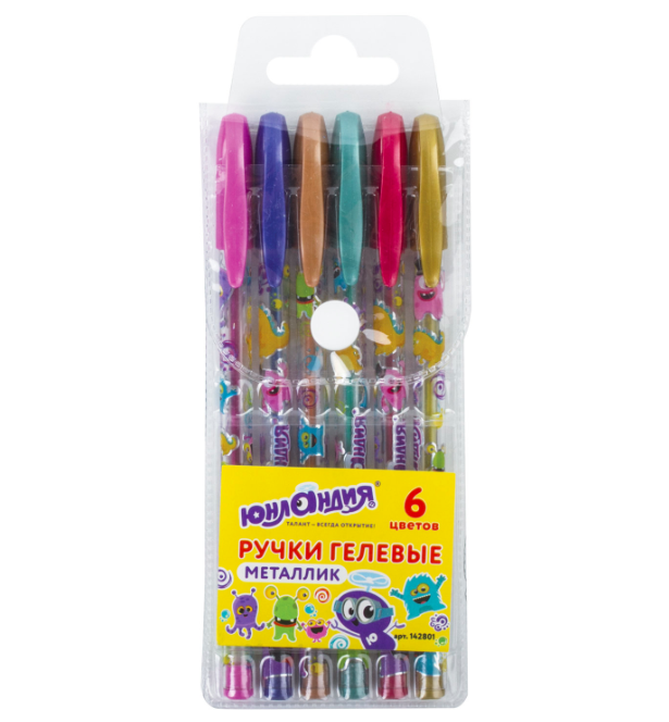 кс_Ручки гелевые арт. 142801 ЮНЛАНДИЯ,набор 6 шт.,АССОРТИ МЕТАЛЛИК,с печатью,узел 0,7 мм,линия письРучка имеет круглый яркий с печатью корпус. Сменный стержень длиной 130 мм со стандартным наконечником позволит использовать ручку максимально долго. Диаметр пишущего узла, равный 0,7 мм, создает линию письма, равную 0,5 мм.