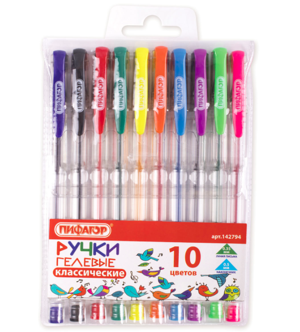 кс_Ручки гелевые ПИФАГОР, 142794 набор 10 шт. АССОРТИ, корп.прозрач.,узел 0,5 мм, лин.письма 0,35 ммРучка имеет шестигранный прозрачный корпус и рифление в зоне захвата для удобства письма. Сменный стержень длиной 130 мм со стандартным наконечником позволит использовать ручку максимально долго. Диаметр пишущего узла, равный 0,5 мм, создает линию письма, равную 0,35 мм. Набор включает гелевые ручки из 10 необычных цветов чернил: зеленый, розовый, фиолетовый, синий, оранжевый, желтый, темно-зеленый, черный, голубой, красный. Цвет деталей соответствует цвету чернил.