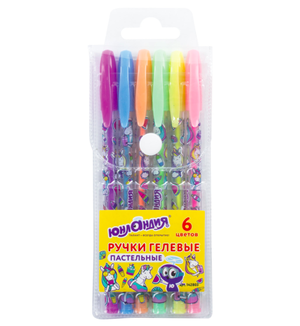 кс_Ручки гелевые ЮНЛАНДИЯ, 142803 набор 6 шт. АССОРТИ ПАСТЕЛЬ,корпус с печатью,узел 0,7 мм Ручка имеет круглый яркий с печатью корпус. Сменный стержень длиной 130 мм со стандартным наконечником позволит использовать ручку максимально долго. Диаметр пишущего узла, равный 0,7 мм, создает линию письма, равную 0,5 мм. Набор включает гелевые ручки из 6 различных чернил пастельных цветов: желтый, зеленый, фиолетовый, оранжевый, розовый, голубой.