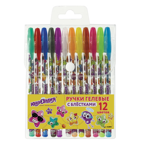 кс_Ручки гелевые арт.142805 ЮНЛАНДИЯ, НАБОР 12 шт,АССОРТИ БЛЕСТКИ,корпус с печатью,0,7мм,линия 0,5ммВ наборе 12 цветов чернил: красный, зеленый, ярко-зеленый, черный, оранжевый, фиолетовый, синий, желтый, серебряный, голубой, коричневый, розовый.