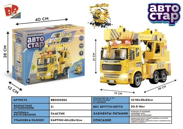33.10 руб. 66.19 руб. - Конструктор арт. 1924" Кран на бат. в кор. 40*28*12 /12шт.//бл./×Конструктор арт. 1924" Кран на бат. в кор. 40*28*12 /12шт.//бл./Модель - машина Кран серии "Городские службы" содержит 115 деталей. Фары светятся, звук двигателя и предупреждающий сигнал. Конструктор отличается высокой проработкой деталей. Уровень сложности подойдет всем, кто уже знаком с конструкторами из кубиков.