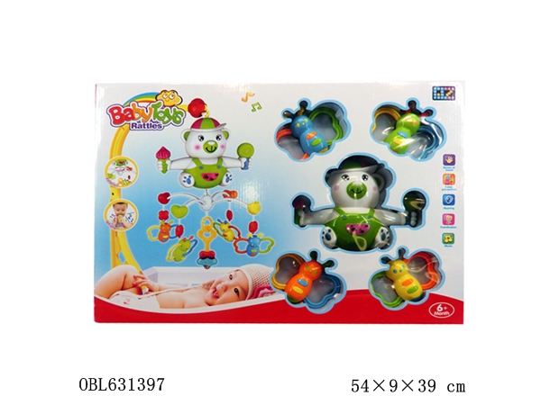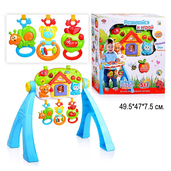 К основной панели снизу крепятся 3 игрушки, которые можно снять при желании. Каждая из игрушек выполняет свою определенную функцию. Улитка издает определенный звук при нажатии на ее раковину. Медвежонок выполняет роль погремушки, а также развивает мелкую моторику, благодаря 3-м колечкам, нанизанным на ось, которые так интересно перебирать. Яблоко с гусеницей помогает понять ассоциативный ряд и улучшает пространственное мышление.