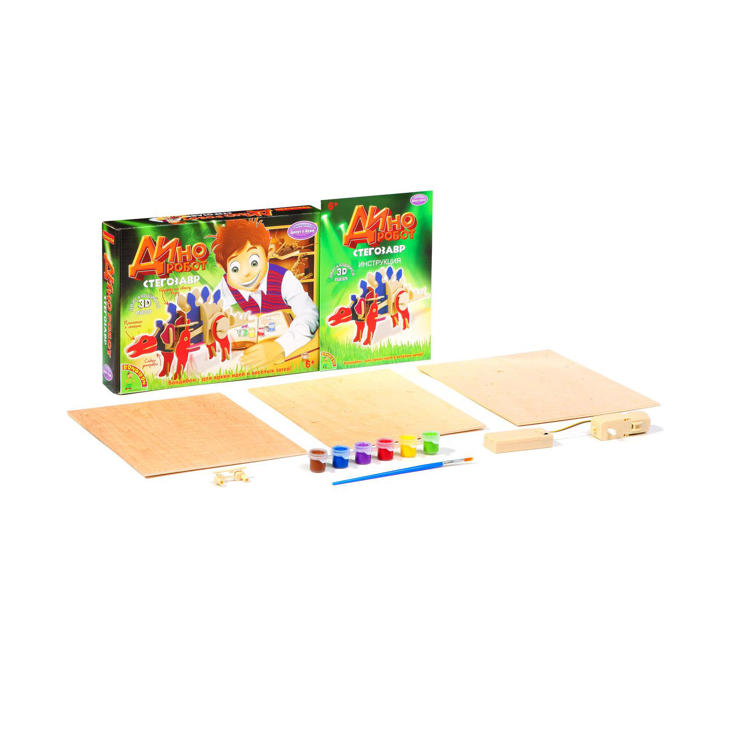 В наборе: 40 деталей, механизм для движения, краски 6 цветов, кисть, наждачная бумага, инструкция с иллюстрациями. Требуются 2 батарейки ААА (не входят в набор).