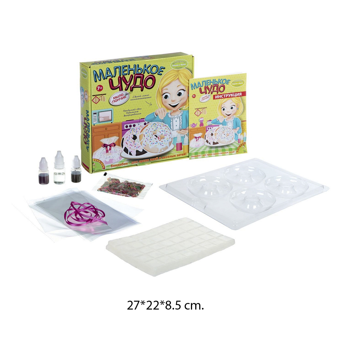 Комплект: 4 формы-пончика, отдушка, краситель, лента, посыпка, декор, ингредиенты для мыла, инструкция.