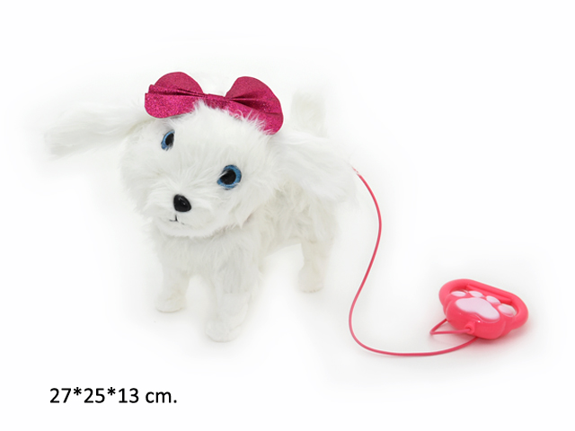 им Собака арт. 810-38" Белая на бат. в коробке 17*11*26,5У питомца мягкая и красивая шерстка. Щенок ходит, гавкает, виляет хвостиком и поворачивает голову. Игрушка включается при нажатии на кнопку на поводке.