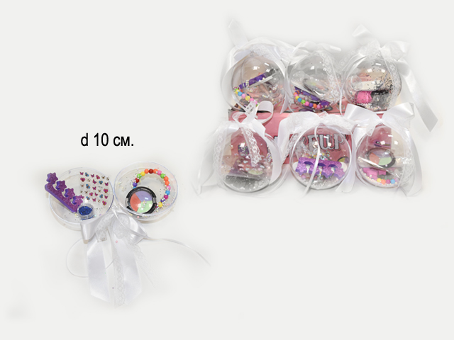 - Набор косметики арт. 50010 "Подарок" в шаре (9 шт.) шоубокс•×Набор косметики арт. 50010 "Подарок" в шаре (9 шт.) шоубокс•Небольшой набор детской декоративной косметики и украшений упакованный в новогодний шар станет чудесным сюрпризом и идеальным подарком для маленькой модницы.