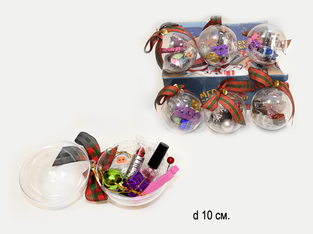 - Набор для маникюра арт. 80010 "Подарок" в шаре (9 шт.) шоубокс•×Набор для маникюра арт. 80010 "Подарок" в шаре (9 шт.) шоубокс•Небольшой набор детской декоративной косметики и новогодних украшений упакованный в новогодний шар станет чудесным сюрпризом и идеальным подарком для маленькой модницы.