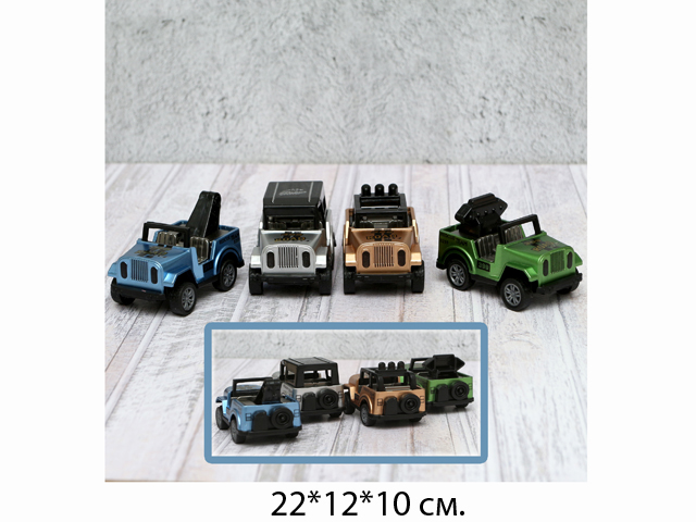 Производитель: Китай115.38 руб. 230.76 руб. - Набор машин арт. 778-4H Джип 4 шт. в кор. 26,5*9,5×Набор машин арт. 778-4H Джип 4 шт. в кор. 26,5*9,5Игровой набор 4 машинки внедорожники с открытым верхом