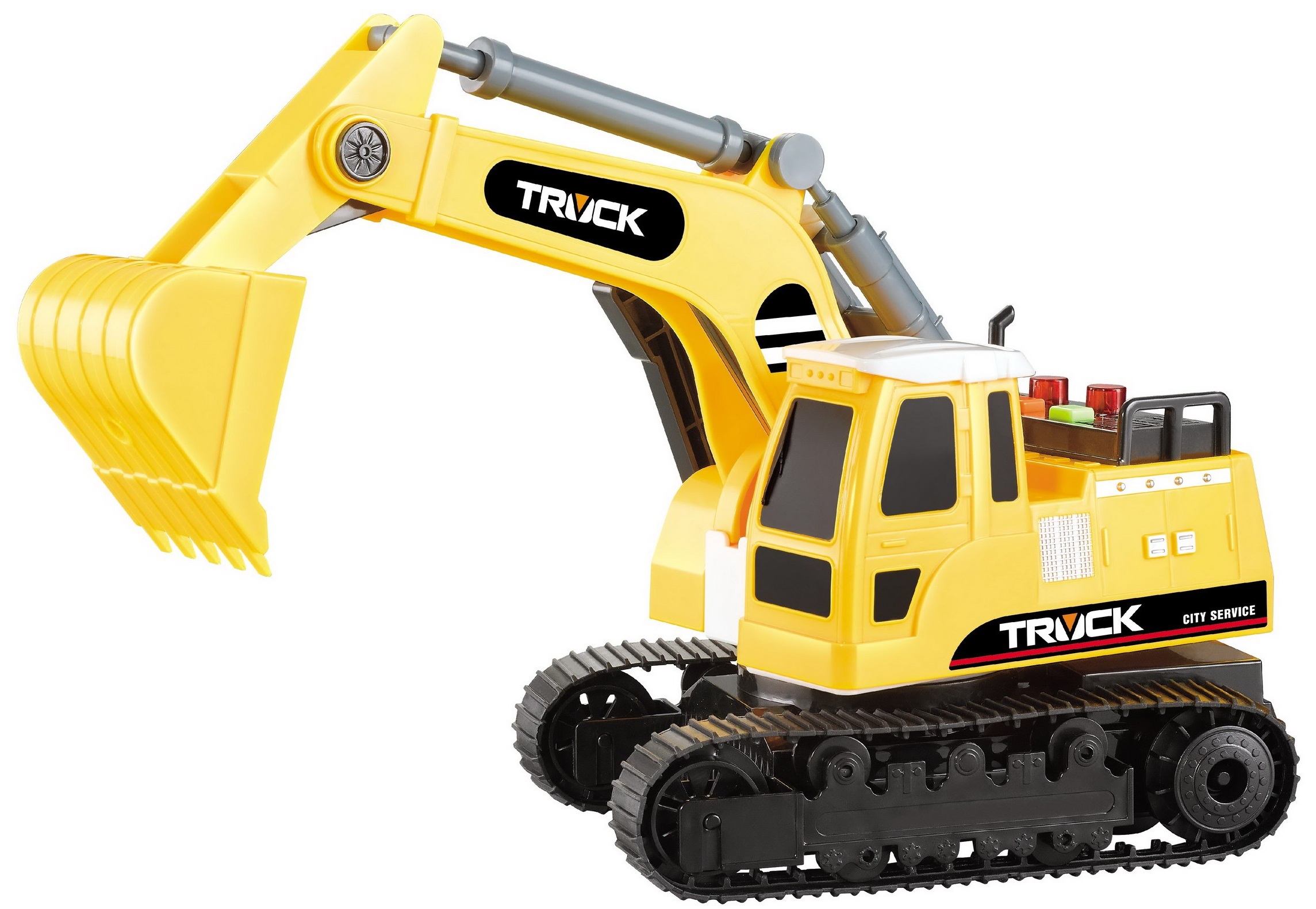 Гусеничный экскаватор имеет яркий дизайн, его можно двигать вперед и назад, кабина вращается, ковш подвижный. Игрушка работает без батареек.